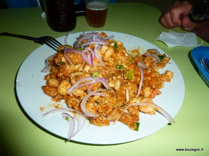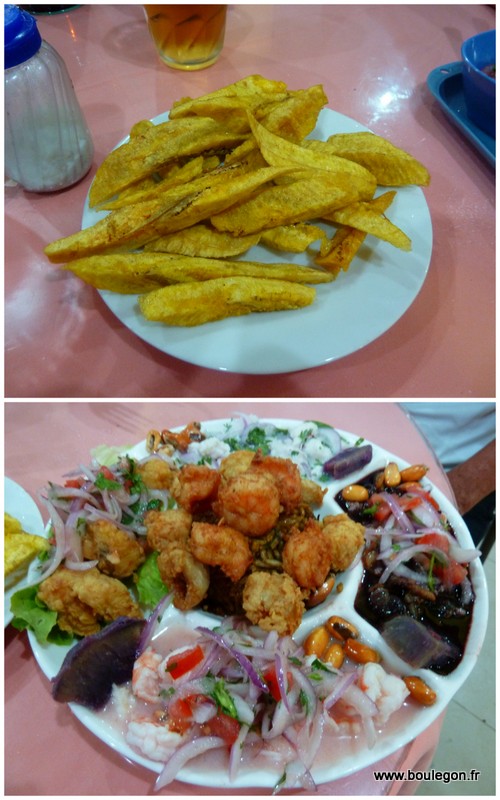Un plat typique du coin avec fruits de mer et bananes écrasées et