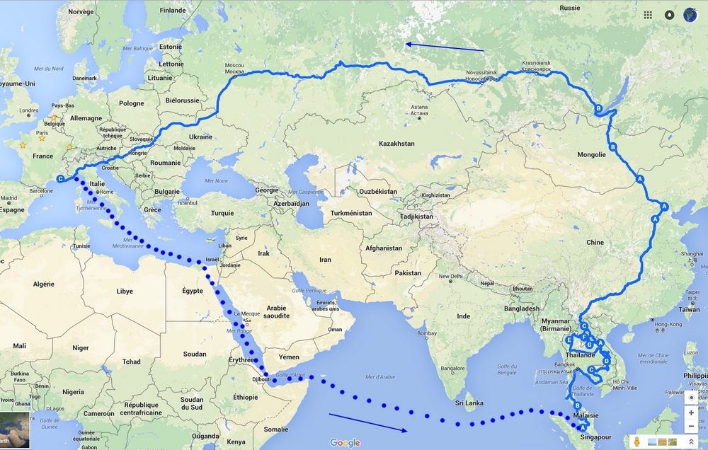 Nous visiterons la Malaisie, La Thailande, le Laos, le Cambodge, la Chine, la Mongolie et la Russie sur 8 mois de voyage.
