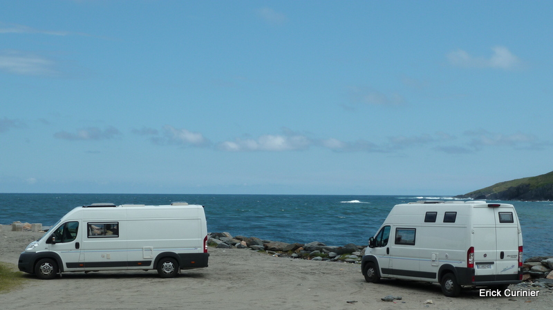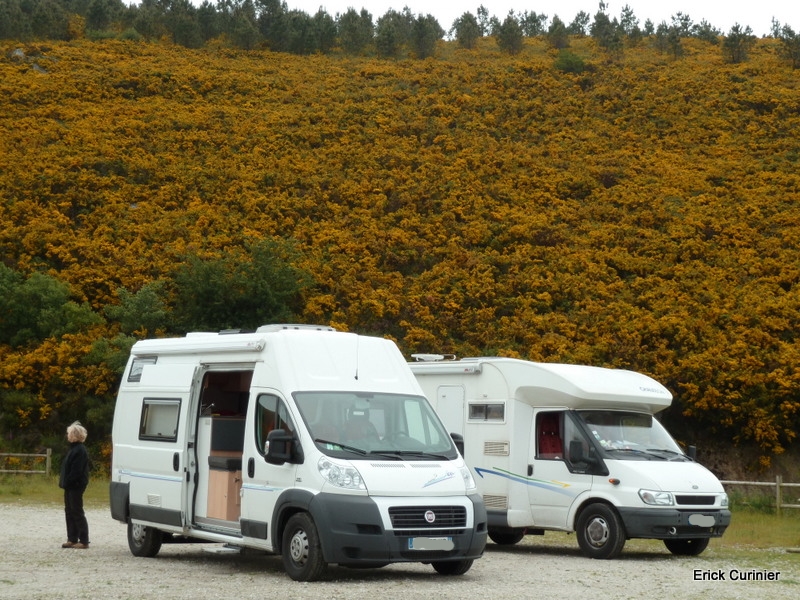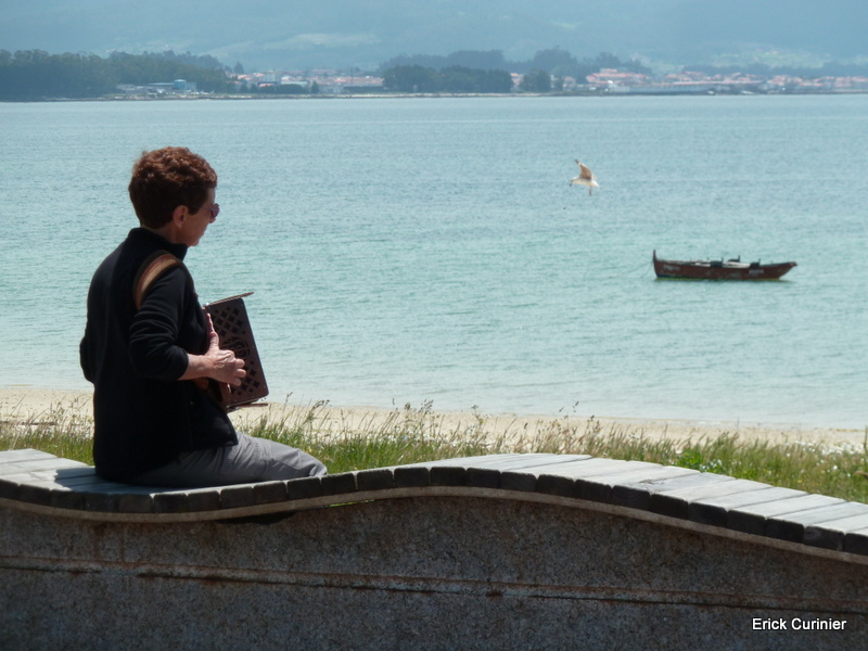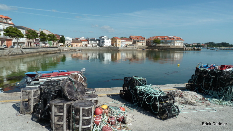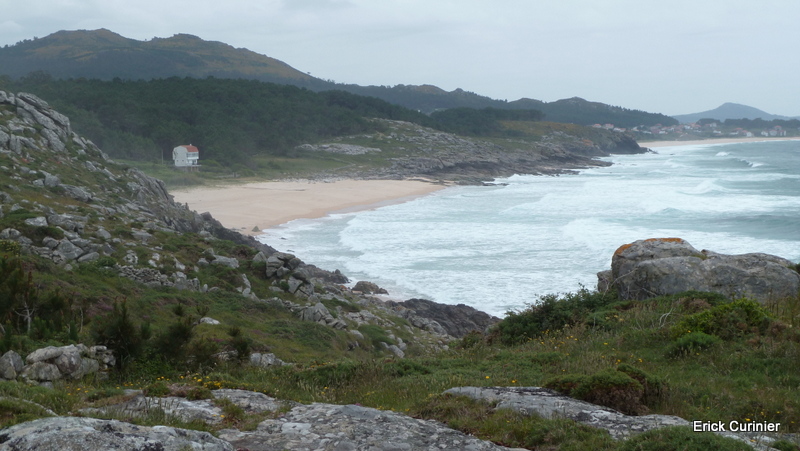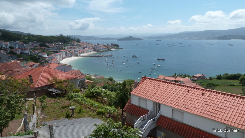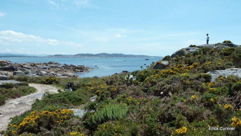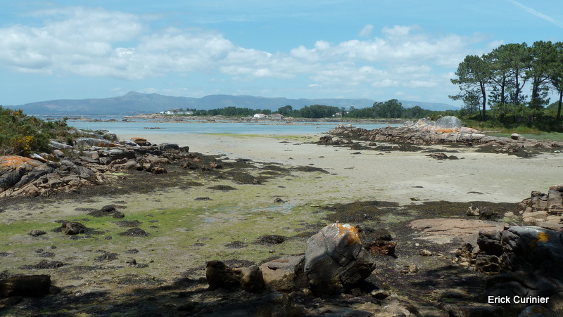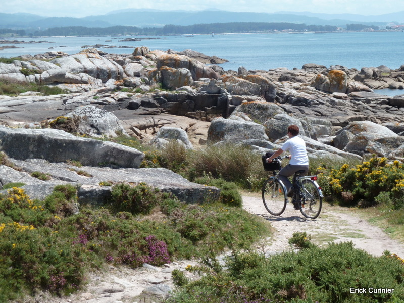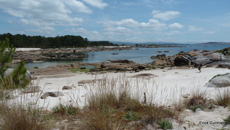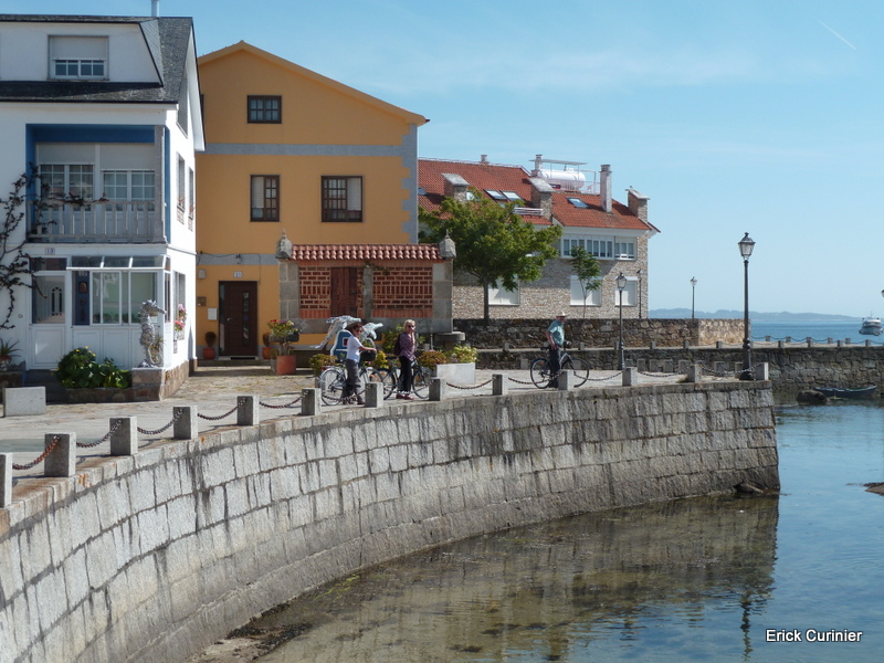 Ce matin après une nuit très arrosée (par le ciel !), le moral de toute la troupe est dans les chaussettes (bien au chaud :)). On envisage le pire mais un regard vers notre météo favorite sur l'Iphone nous annonce le beau temps pour midi et la les chaussettes se vident, les sourires réapparaissent, les projets positifs se reforment. Nous repérons une petite île accessible par un pont , l'Illa Arrousa. Nous y sommes rendus en 1 heure à peine et découvrons un coin très sympa en plus sous le ciel bleu (une première pour nous en Galice) par 20° (on étouffe !). C'est décidé on s'installe au bord de la plage, on sort les vélos et c'est parti pour explorer ce petit coin de paradis.