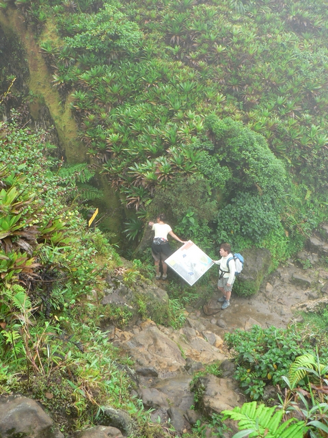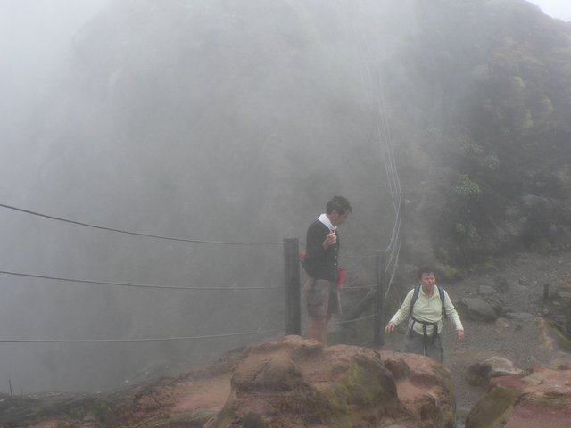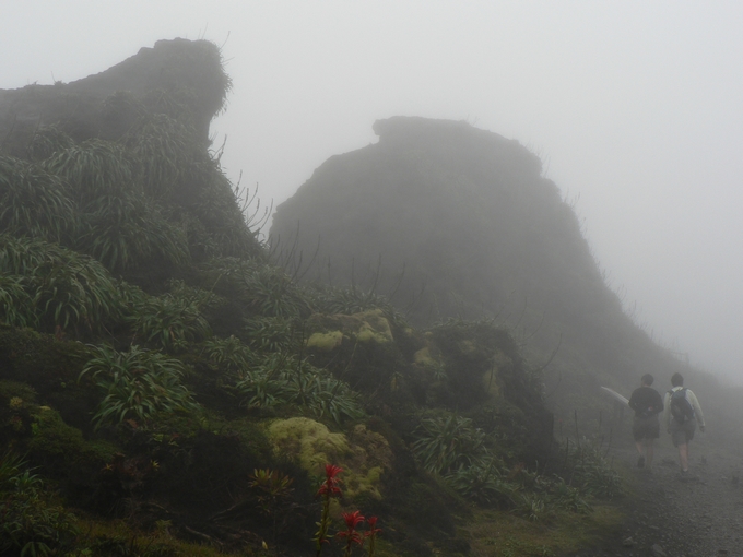 L'arrivée au sommet (non, non, nous n'avons pas eu de pluie, mais marcher dans les nuages produit une humidité certaine et dans ces conditions impossible de garder ses lunettes, ce qui rend l'atmosphère encore plus irréelle !)