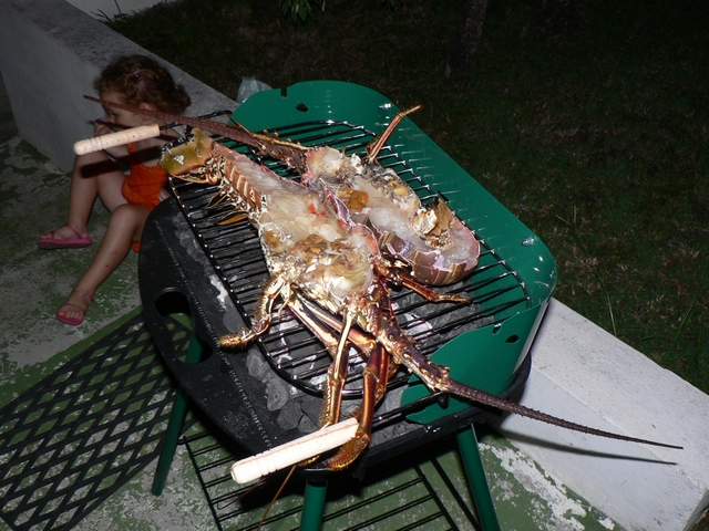 Un autre plaisir de la Guadeloupe : les langoustes au barbecue ! De belles pièces achetées sur le port de Pointe à Pitre à un pêcheur très sympathique. Bien sûr elles étaient vivantes et il a fallu les couper en deux avant de les mettre sur le grill. Deux volontaires expérimentés ont réussi cette lourde tache avec brio. Un vrai régal !!