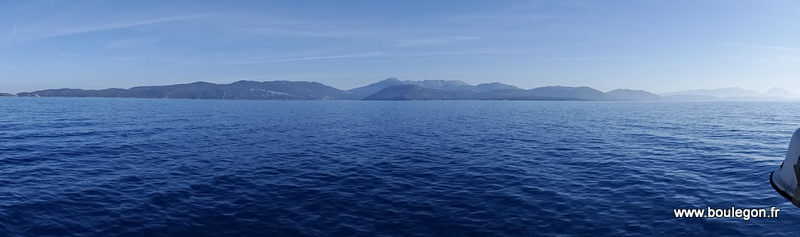 entre les îles de Leucade, Céphalonie et Ithaque. La mer est d'un bleu