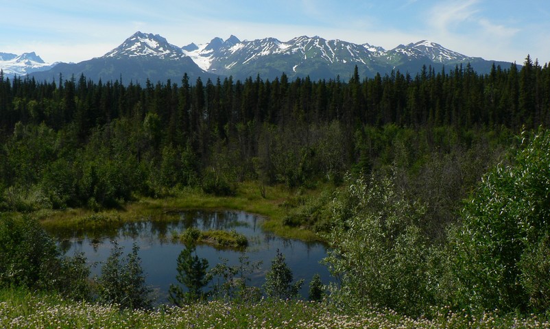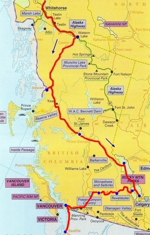 Longue étape de jonction un peu monotone. Nous changeons complètement de monde. Après 4 semaines passées dans un pays totalement sauvage où l'homme est réduit à quasi néant, nous nous retrouvons dans une région domestiquée par lui (pistes de ski, villes tous les 50 km, cultures un peu partout, villes très clean avec toutes les chaines nord américaines). Les seuls animaux vus aujourd'hui sont des vaches, des chevaux et des moutons. C'est un véritable choc après l'Alaska et le Yukon si sauvages. Nous avons un peu de mal à nous replonger dans la civilisation !! Pas de photos, les paysages étant très quelconques (pas de montagnes, des collines , des forêts, des lacs) après les merveilles vues ces semaines passées.