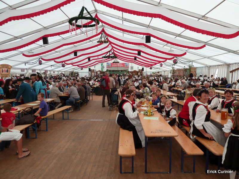 une grande soirée sous chapiteau avec bière, saucisses et frites à