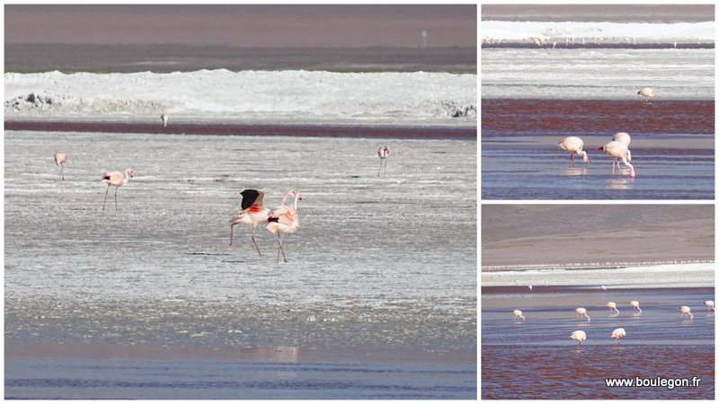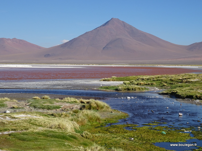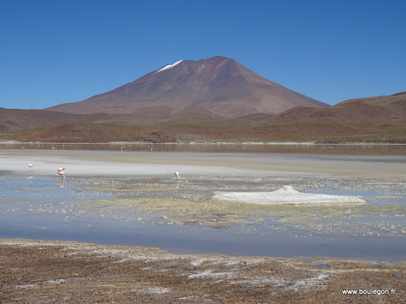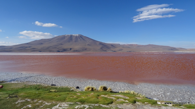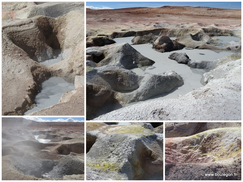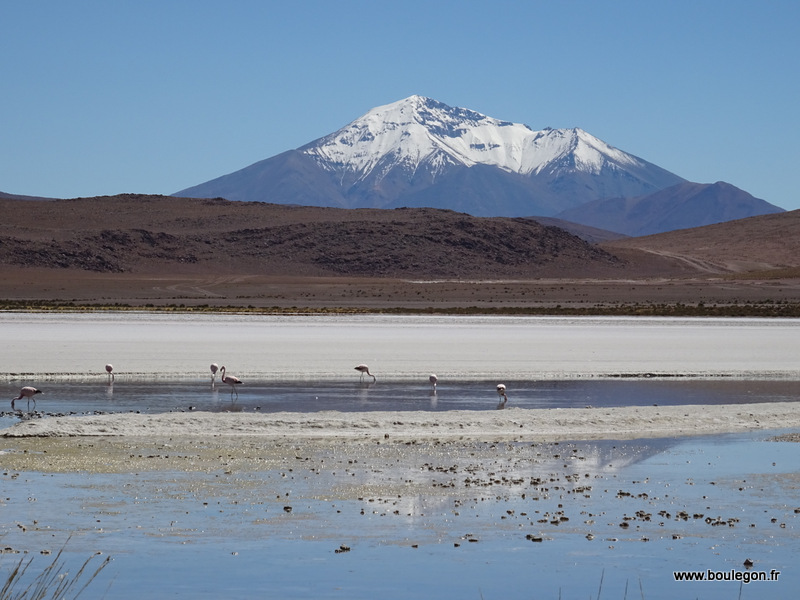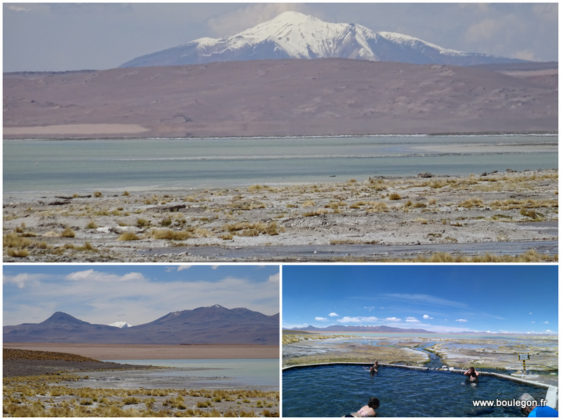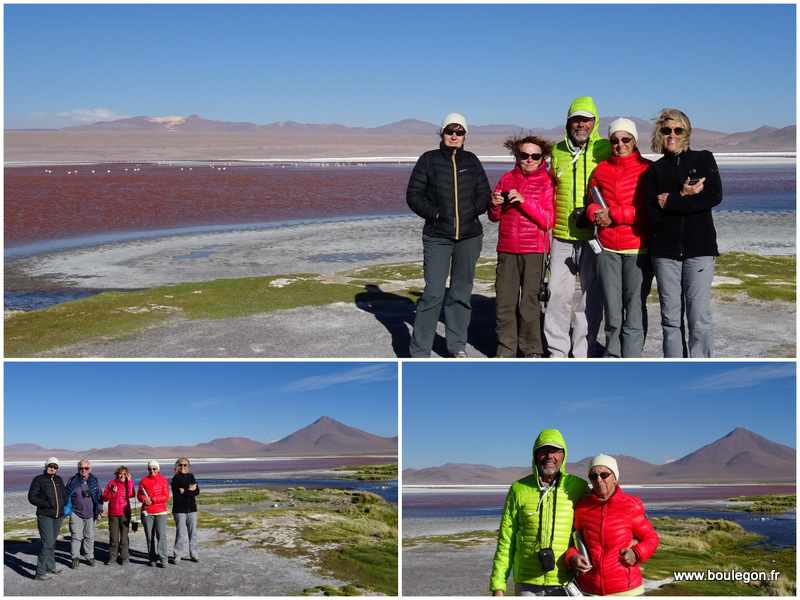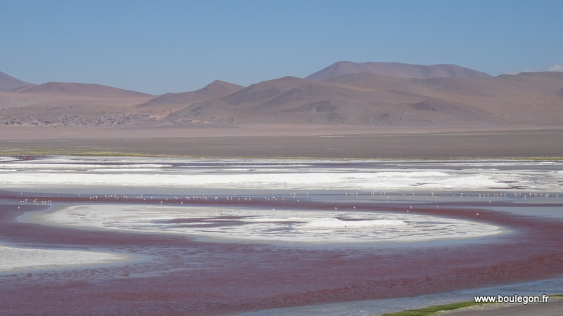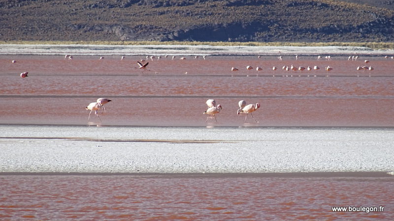Cette première journée est éblouissante. Nous pouvons admirer les lagunas Blanca et Verde, prendre un bain dans les eaux thermales de Polques (quasi seuls dans la piscine), marcher au milieu des geysers et des trous remplis de boues bouillonnantes, traverser le désert de Dali et enfin balader au bord de la sublime Laguna Colorada d’un rouge étonnant et peuplée de milliers de flamands roses.