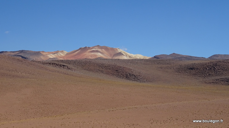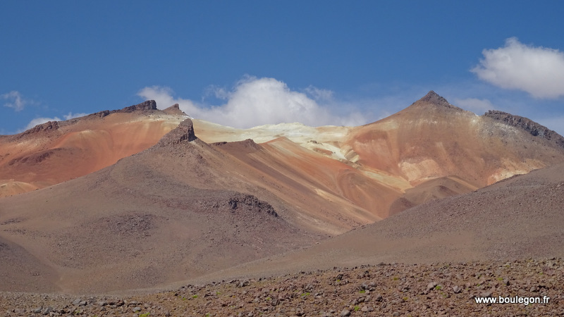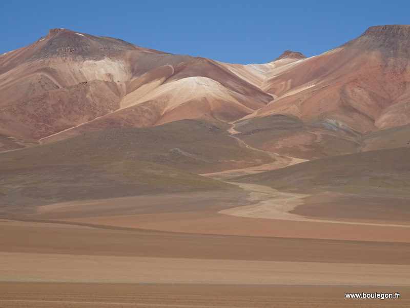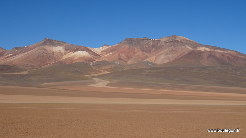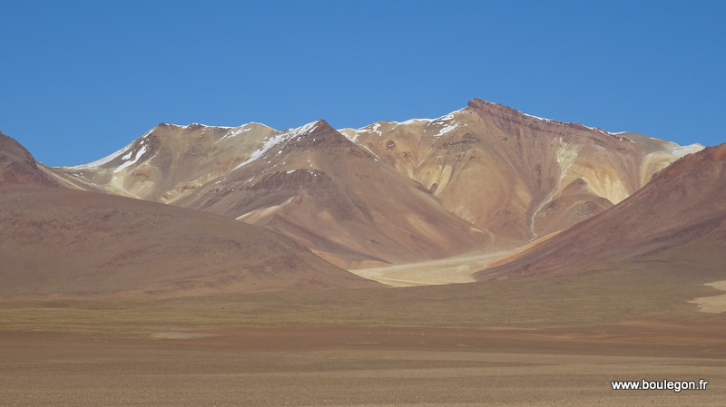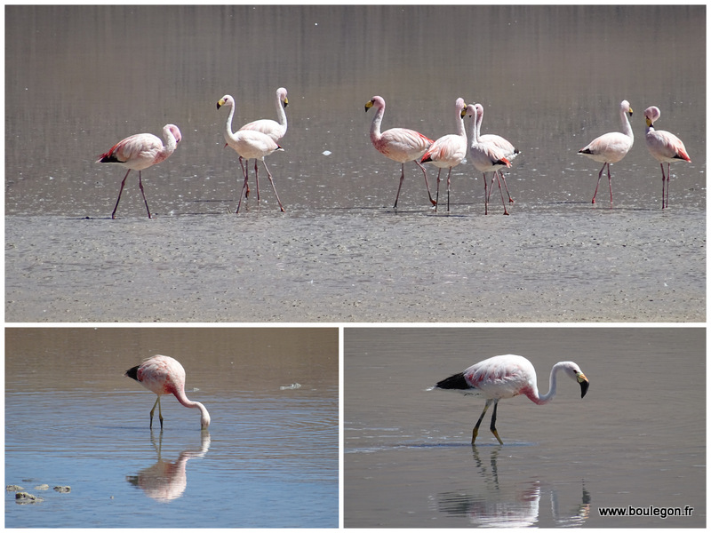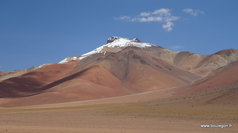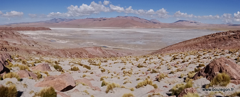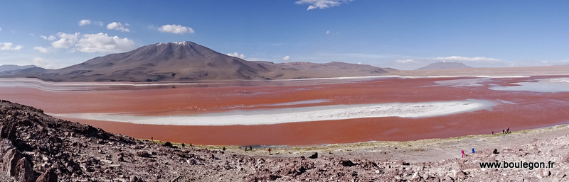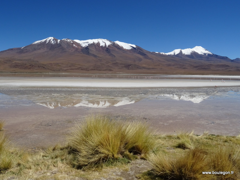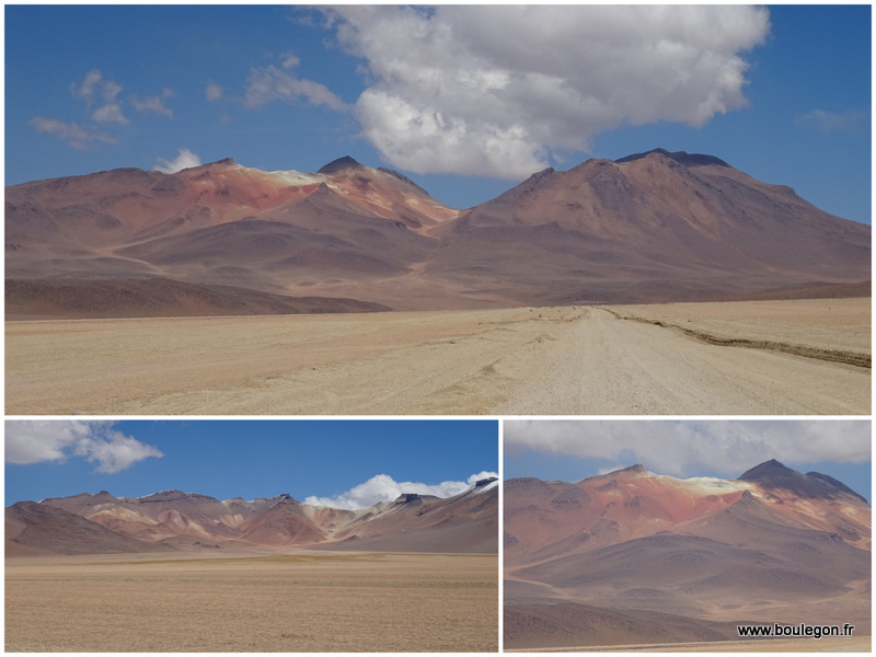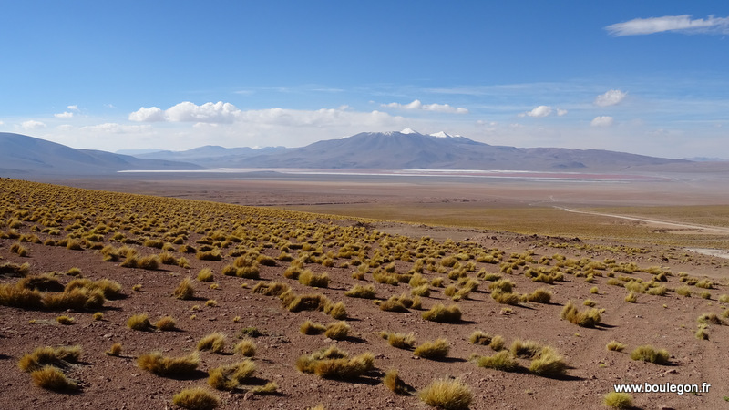 Cette première journée est éblouissante. Nous pouvons admirer les lagunas Blanca et Verde, prendre un bain dans les eaux thermales de Polques (quasi seuls dans la piscine), marcher au milieu des geysers et des trous remplis de boues bouillonnantes, traverser le désert de Dali et enfin balader au bord de la sublime Laguna Colorada d’un rouge étonnant et peuplée de milliers de flamands roses.