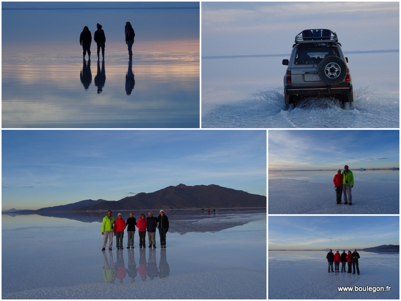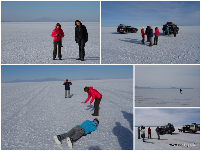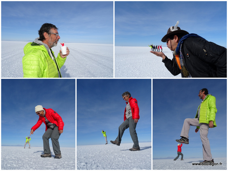 Nous ne pourrons pas rejoindre l'île d'Incahuasi car il y a trop d'eau mais nous pouvons quand même traverser le Salar jusqu'à Colchani. En route nous avons droit à la traditionnelle séance de photos qui en raison de l'immensité des lieux permet de faire des trucages bien amusants.
