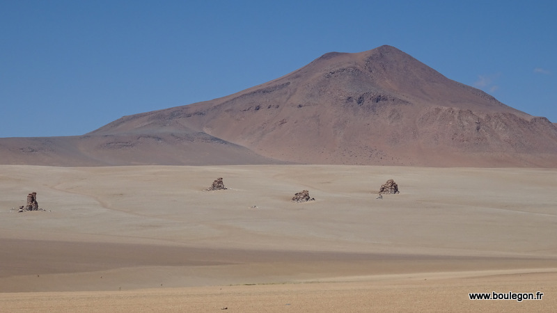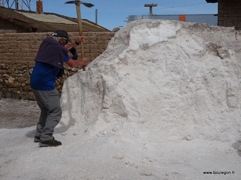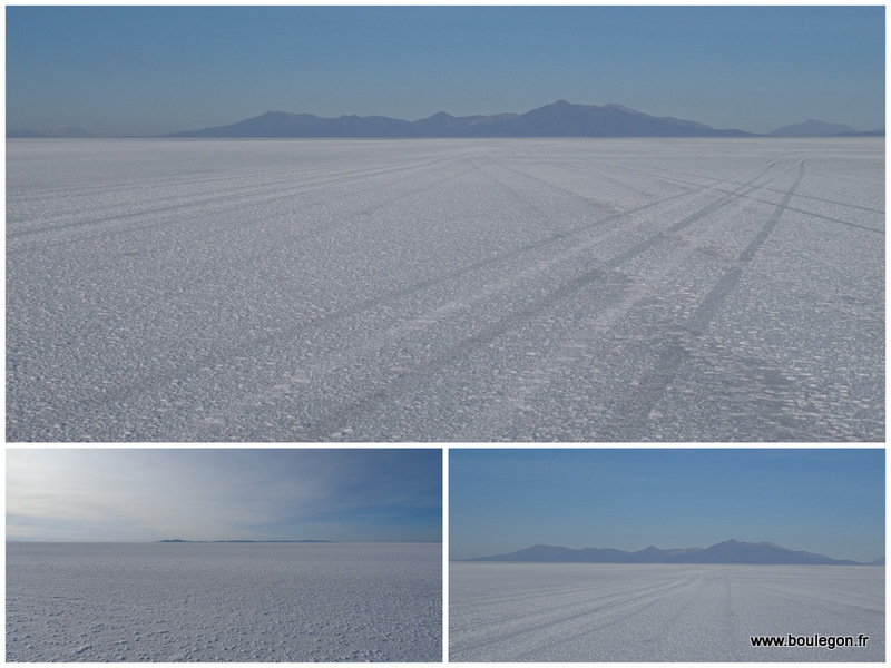 Après une mauvaise nuit à 4300m, nous nous levons à 6h du matin pour un départ à 7h. A 7h, toujours pas de petit déjeuner ! Puis on voit passer notre guide en petite tenue pour aller prendre sa douche ! Il avait tout simplement oublié de nous dire que l’heure bolivienne était décalée d’une heure ! Nous partons ensuite pour une étape plus longue qu’hier (260km sur des pistes souvent défoncées) et assez fatigante. Mais les paysages sont encore superbes, même si on les trouve un cran en dessous de ceux d’hier (on chipote, on chipote). Nous rejoignons enfin le Salar d’Uyuni apparemment inondé et notre hôtel de sel.