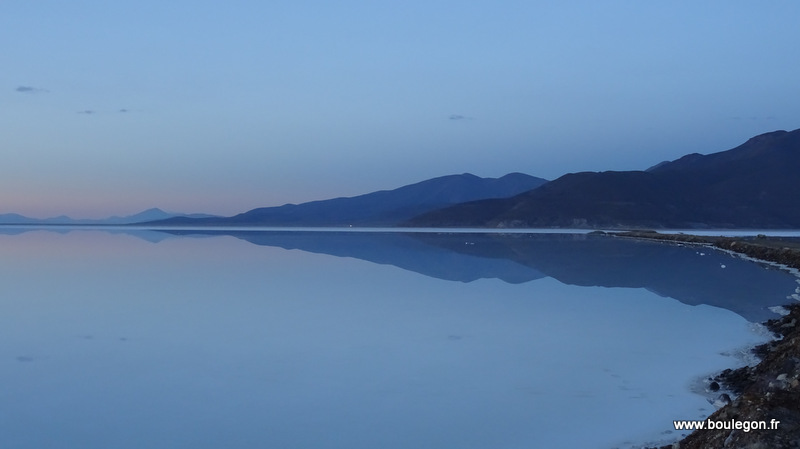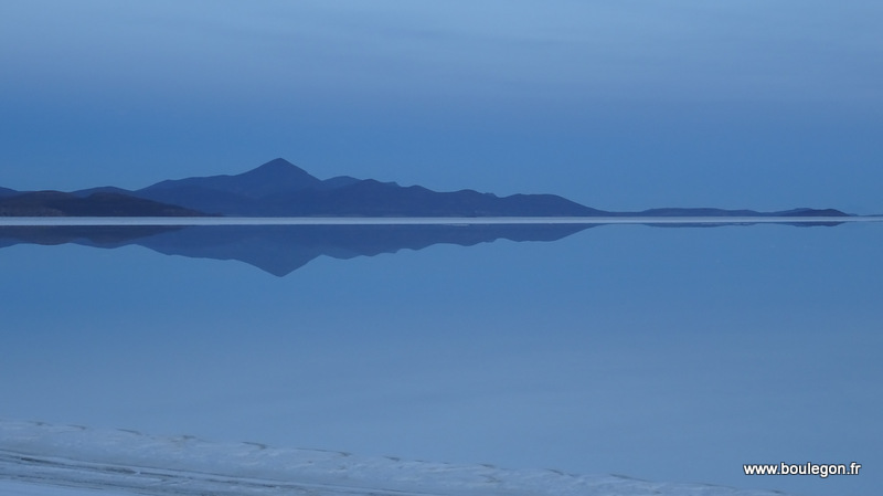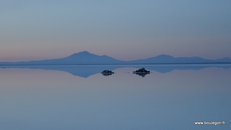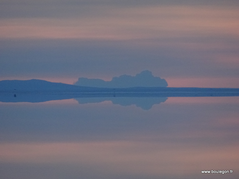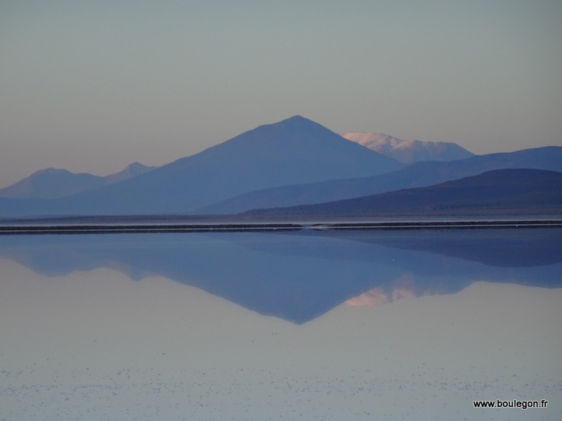 La nuit a été réparatrice. Nous nous levons quand même à 5H du matin pour un départ à 6H afin de voir le lever de soleil sur le Salar d'Uyuni. Cela en vaut vraiment la peine. le Salar, en grande partie inondé en cette saison, est un magnifique miroir dans lequel se reflètent les montagnes environnantes.