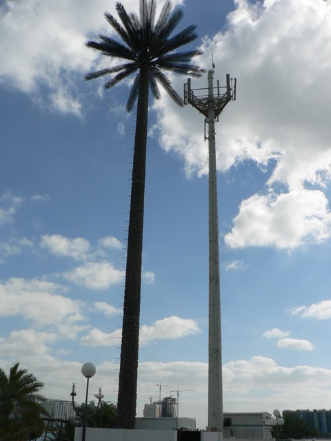Ici on camoufle les antennes de téléphone dans de faux palmiers (à gauche)