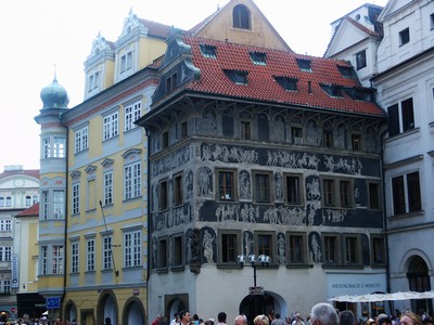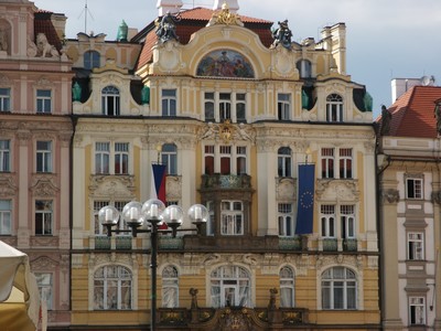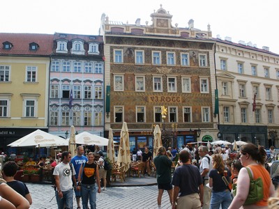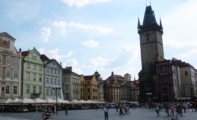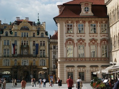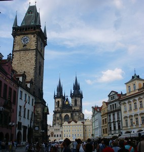 Après-midi : Prague. Après nous être installés au camping, nous allons faire une première visite du centre de Prague. La ville est magnifiquement rénovée, nous déambulons dans la zone piétonne et découvrons à chaque coin de rue de magnifiques bâtiments, des placettes accueillantes, des passages couverts tous plus charmants les uns que les autres, des ruelles tortueuses et bordées de demeures richement décorées. Le clou de la visite est la découverte de la superbe place de la vielle ville. Malgré la présence d'une foule immense, c'est un régal de s'y promener et de découvrir tout ce quartier.