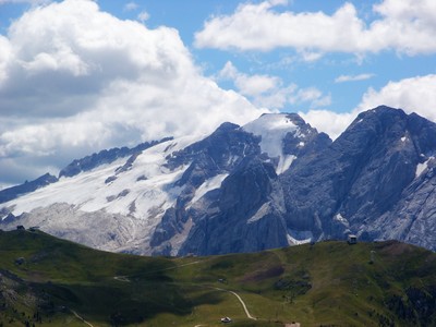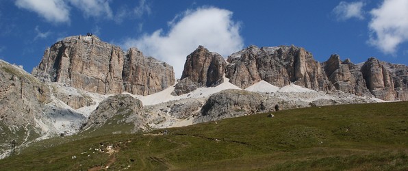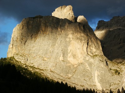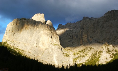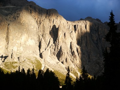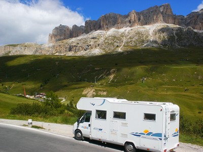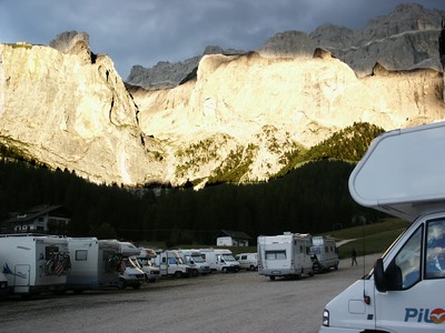 Nous quittons l'Autriche avec le sentiment de ne pas avoir pu profiter des beaux paysages que ce pays offre, mais nous en avons vraiment assez de la pluie et du froid. C'est sous des trombes d'eaux que nous filons vers le col de Brenner derrière lequel nous retrouvons le soleil, le ciel bleu (avec des nuages de ci de là quand même) et la luminosité qui va avec. Par contre on sent tout de suite que la mentalité et les moyens financiers des italiens ne sont pas ceux des autrichiens. Lorsque l'on traverse les villages, règne une organisation tout à fait méditerranéenne (en opposition à la rigueur autrichienne), ce qui n'est pas pour nous déplaire. Tout est moins parfait, mais plus vivant ! Nous arrivons dans les Dolomites au paysages très différents de leurs voisins autrichiens pourtant distants de 70 km seulement. Nous retrouvons les beaux chalets dans les stations de montagnes traversées. Nous nous installons après Selva sur un parking réservé aux camping-cars, au pied de magnifiques falaises typiques de cette région. Un enchantement lorsque le soleil couchant les éclaire. Seul hic, il fait froid 8° (nous sommes en altitude) et nos réserves de gaz s'épuisent, donc pas de chauffage !