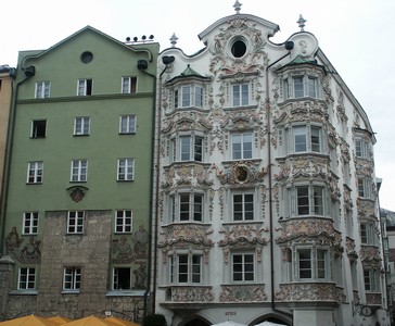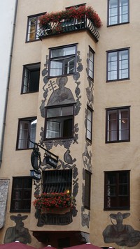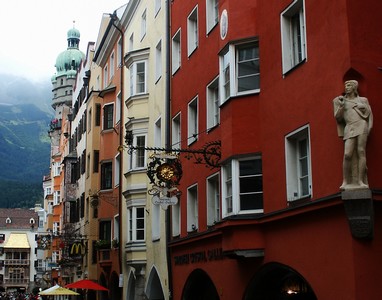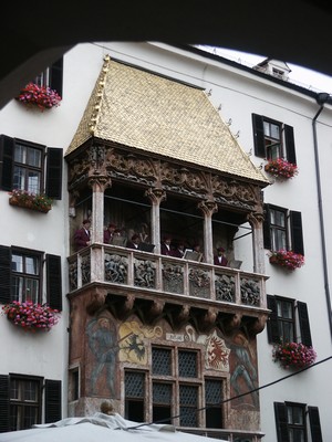 Jour 32 - 7 août : Temps déplorable en Autriche, beau mais frisquet en Italie. Il a plu toute la nuit et nous nous réveillons avec la pluie. Le moral baisse. Nous décidons de visiter Innsbruck et de quitter l'Autriche pour l'Italie et les Dolomites. La pluie s'arrête juste le temps de la visite d'Innsbruck qui est une belle ville médiévale, du moins son centre. On en a vite fait le tour car en fait le centre est très petit mais si vous passez par là, arrêtez-vous et baladez-vous dans les rues, le nez en l'air. Dernier repas dans une taverne autrichienne (pas la meilleure, malgré le joli cadre).