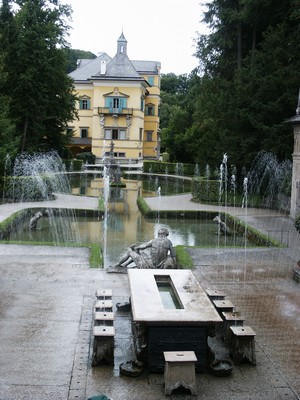 L'après-midi nous filons vers le château (encore un !) d'Hellbrunn dans la banlieue de Salzburg. Nous ne visiterons pas les appartements (on a déjà donné !) mais un curiosité de ce château. Un archevêque amateur de farces et passionné par les jeux d'eau a fait aménager toutes sortes de grottes, d'animations (théâtre en miniature), de fontaines etc (d'un goût souvent discutable soit dit en passant), le tout agrémenté de jets d'eaux plus ou moins coquins (les plus célèbres étant ceux sortant des chaises des convives et leur arrosant copieusement les fesses !!!). Lors de la visite il vaut mieux être protégé de l'eau car des jets jaillissent de ça et de là et vous arrosent ! C'est une visite qui sort de l'ordinaire. Amusant et étonnant !