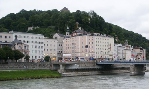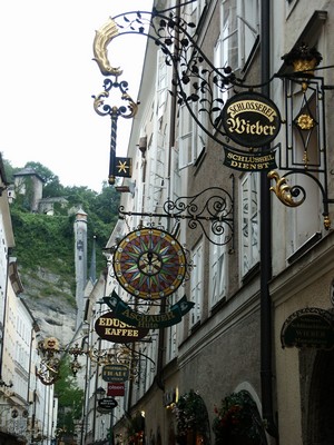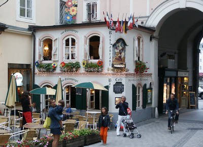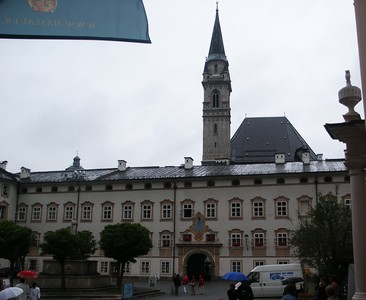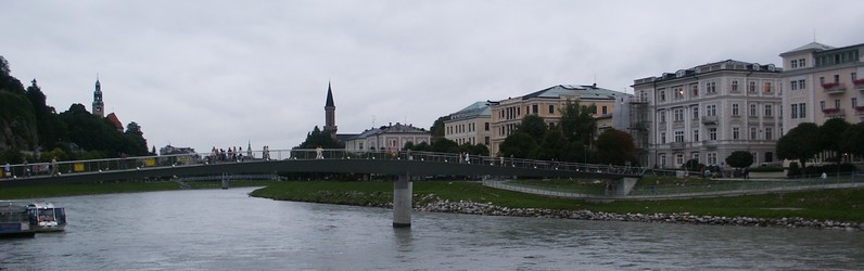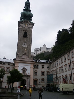 Quel dommage qu'il fasse si gris pour visiter Salzburg ! Nous rajoutons des épaisseurs (pull + anorak) et descendons en ville toujours avec notre scooter. Salzburg est une ville très agréable car à taille humaine. On y trouve de belles rues piétonnes, des places vastes (manquant un peu de bars avec terrasse mais vu le temps !), des coins de verdure, des monuments pas trop monumentaux (contrairement à ceux de Vienne). Pratiquement tout le centre ville est réservé aux piétons. Nous visitons le matin la maison de Mozart (ici tout tourne autour de Mozart malgrè l'aversion que ce dernier avait pour cette ville). La maison en elle-même n'a que peu d'intérêt mais c'est l'occasion, grâce à un audio guide très bien fait, d'écouter la musique de Mozart et de redécouvrir ce que fut sa vie. Une visite à conseiller.