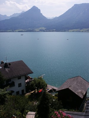 A la mi-journée nous partons en direction de Salzbourg. En cours de route nous nous arrêtons au bord du très beau lac de Wolfgang aux eaux limpides et bleu turquoise. Décidément le lac Balaton ne supporte définitivement pas la comparaison ! Par contre la visite de St Wolfgang nous déçoit. Rien à voir avec Hallstatt. Ici c'est le royaume du tourisme de masse et en dehors de quelques belles maisons, cela ne vaut pas le coup de s'y arrêter d'autant plus que tout est fait pour vider notre porte-monnaie. Le parking est à 8€ pour les camping-cars que l'on s'arrête 1h ou 24h ! Nous avons préféré nous garer à 5 km et venir en scooter, cela nous permet en plus d'explorer les toutes petites routes longeant le lac.