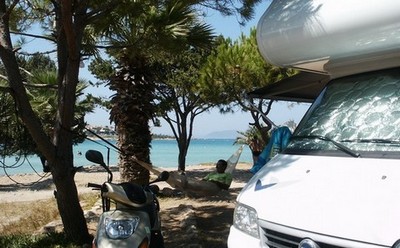 Olympiados : A 15 km de Stavros en direction d'Halkidiki. Nous connaissions un petit coin de paradis (à 2 km après Olympiados sur la gauche) que nous avons voulu retrouver. La plage est toujours aussi belle, l'eau toujours aussi claire mais un plagiste a eu la mauvaise idée de s'installer, d'utiliser un groupe électrogène au gasoil et de diffuser de la musique toute la sainte journée et même la nuit ! Voilà comment un coin de paradis (3 étoiles) devient un coin d'enfer (0 étoile) ! Dommage, nous aurions pu y rester 2 ou 3 jours. Nous trouvons 2 autres criques où l'on peut se poser sans problème. La plus tranquille (mais plage moins belle et présence de vaches donc de mouches) est la plus éloignée d'Olympiados (3 ou 4 km vers Halkidiki). La première en venant d'Olympiados est elle aussi occupée en partie par un plagiste mais son groupe électrogène est très discret, et la crique est si belle ! Nous nous en contenterons (bien que ce ne soit pas le paradis) car nous n'avons pas envie de rouler.