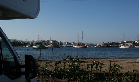 Gümüslük * (presqu'île de Bodrum) : Prendre à gauche un chemin de terre à l'entrée du parking obligatoire puis se diriger vers la plage. Le restaurant Cesel accepte que nous stationnions sur son parking (un terrain vague clos), ce que nous faisons. Calme. Sanitaires sommaires à notre disposition. 10 millions la nuit (moins de 6 euros), c'est un peu cher pour les services offerts (pas d'électricité) mais ici tout est cher. Le restaurant est également assez cher mais bon.