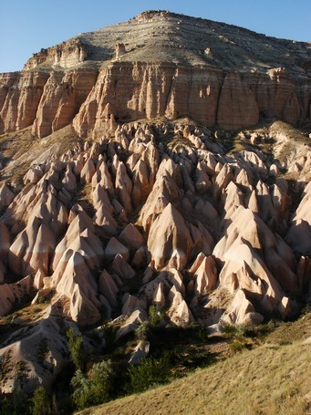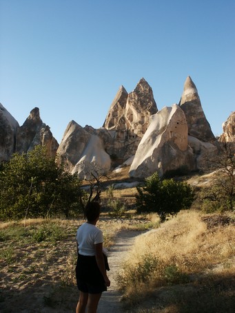 Après la traditionnelle sieste et séance baignade dans la piscine du camping, nous partons pour une nouvelle balade à pied (3h de marche) vers les vallées rose et rouge. Vraiment notre camping est idéalement placé car toutes les merveilles du coin sont à notre porte. En cette fin d'après midi (de 5h à 8h) les couleurs sont magnifiques. En route nous rencontrons une famille turque qui fait des grillades et nous offre gentiment une cuisse de poulet ! Sympa non ? Sur les instructions de Memet (fils du patron du camping) nous partons dans une direction qui ne nous semble pas la bonne. Nous rebrousserons chemin et trouverons finalement le bon chemin dans la direction opposée (on ne se comprend pas toujours bien avec notre anglais approximatif et nos accents différents !). Nous allons encore marcher au milieu de paysages magnifiques, aux couleurs enflammées par le coucher de soleil. Nous traverserons des vallées très encaissées, grimperons sur des rochers déchiquetés etc... Tout ça sans rencontrer personne en dehors d'une famille française. Arrivés au point de vue panoramique convoité nous découvrons une "cafétéria" troglodyte où nous boirons avec délectation un coca vendu à prix d'or pour la Turquie (2,5 millions) mais tellement apprécié et puis le jeune turc qui tient cette buvette a tout monté à pied.