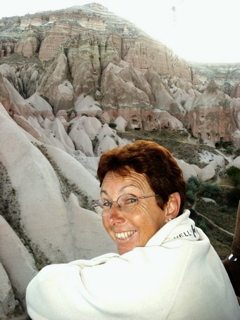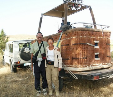 Nous vivons une expérience unique. Lever à 4h30, c'est déjà un exploit pour nous. On vient nous chercher au camping pour un survol en montgolfière de la région. Après un petite collation et un briefing, on nous emmène dans un vallon encaissé et donc à l'abri du vent (assez fort aujourd'hui) pour assister au gonflage du ballon et embarquer. Nous sommes 12 passagers et nous envolons pour un vol d'1h30 absolument merveilleux. Nous survolons les vallées rouge et rose, les sites de Pasabag et de Zelve avant de traverser toute la plaine d'Avanos et d'atterrir en douceur sur la remorque chargée de ramener la nacelle à Goreme ! Le pilote nous a parfaitement conduits, tantôt frôlant des cônes, remontant à raz du sol des vallées, contournant des cheminées de fée et pour finir par un vol en altitude nous donnant une vision bien différente de la région, le tout dans un silence et un confort bien réels. Aucune sensation de balancement (mon mal au cœur légendaire ne s'est pas manifesté), température très agréable, vraiment le bien être total. Bref c'était parfait et malgré le prix de la prestation (170 euros par personne) cela vaut vraiment le sacrifice. A l'arrivée nous avons même bu le champagne en plein champ !
