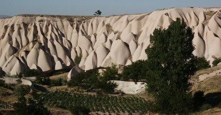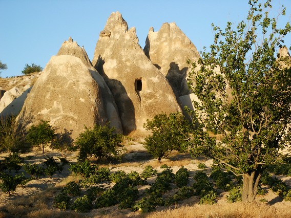 Site du Musée en plein Air de GoremeLe clou de la journée sera la balade à pied que nous ferons à partir du camping. Suivant un itinéraire fléché, nous découvrons des pigeonniers creusés dans la roche (les paysan récupèrent leurs fientes pour fertiliser les terres), des cônes émergeant au milieu des cultures (vignes, cucurbitacées, arbres fruitiers), des cheminées de fée en formation. Comme il est 7h00 et que le soleil se couche, les lumières sont magnifiques. Nous rentrons à regret au camping avant que la nuit ne tombe (il fait nuit à 8h45 ici), nous promettant de faire d'autres balades. Un vrai régal !
